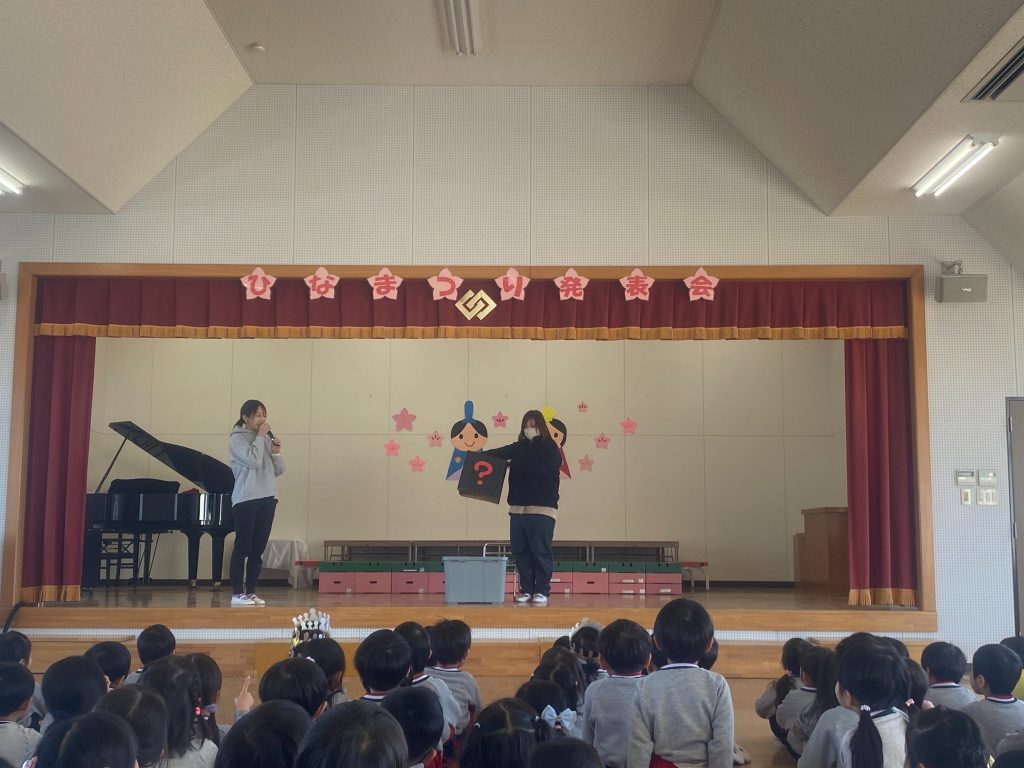 そして、先生たちからの出し物もとっても面白かったですね!穴の開いたハテナボックスから箱の中に何が落ちたのかというクイズをしました。みんなよく見て当てることができましたよ。ボールが落ちてきたり、小さなアンパンマンが落ちてきたりと子ども達は、大盛り上がりでした。