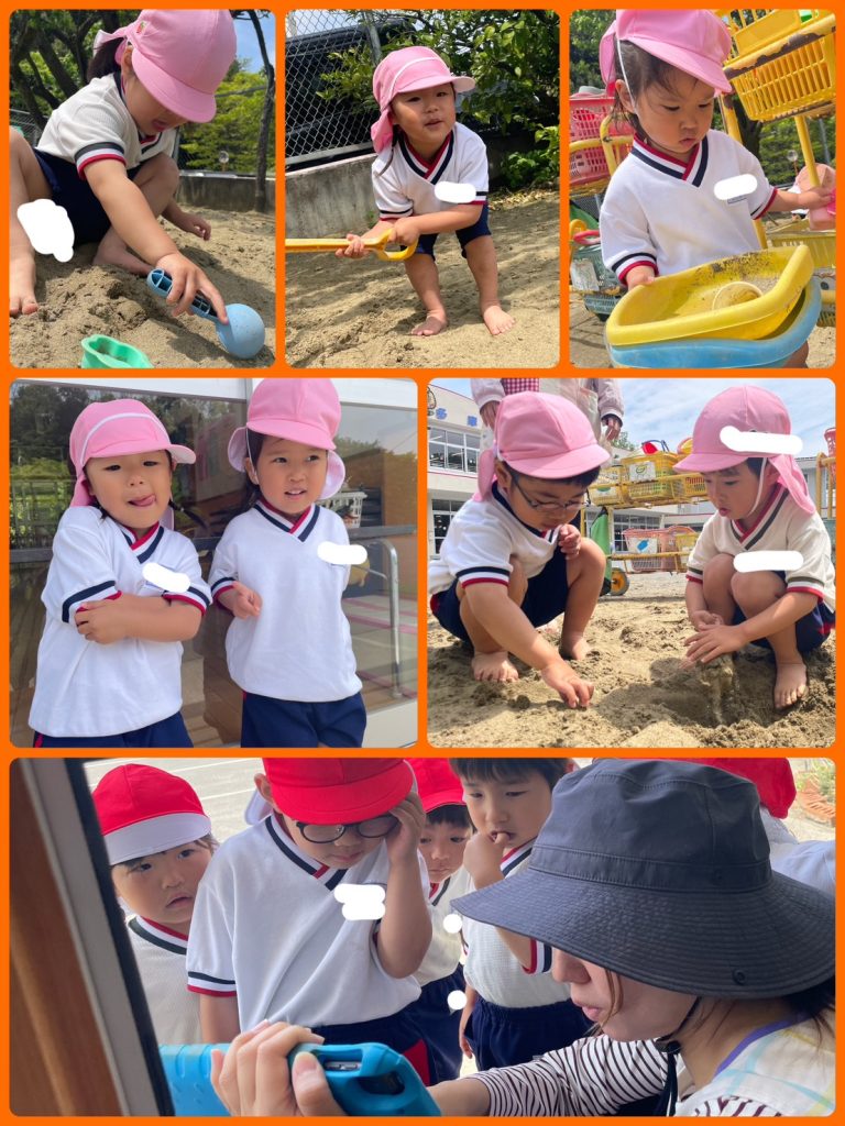 今日はお天気が良く桃組さん(年少)は砂場が大人気です。