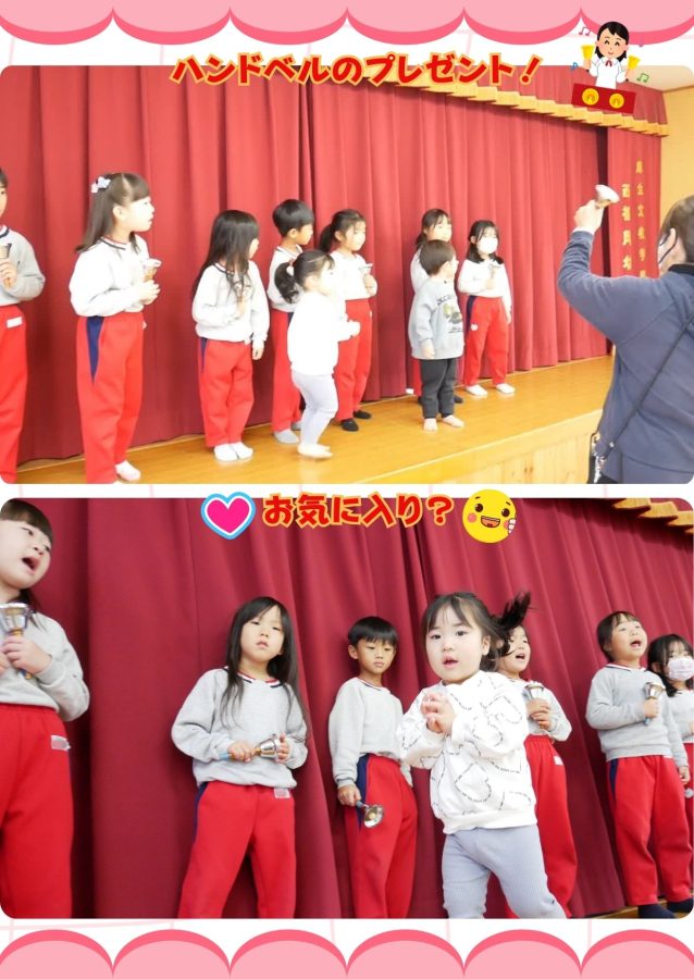 おっと、年長さんからはハンドベルのプレゼント🔔、思わず一緒に体を動かす子の姿も。