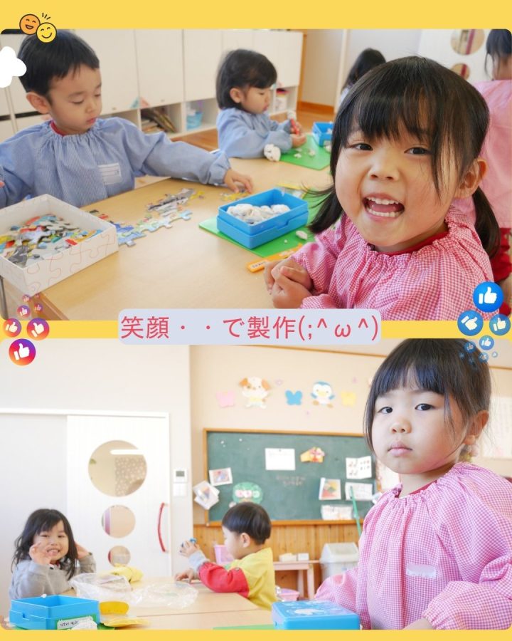 年少さんは、笑顔で製作…と思ったら、こちらをじーっと見つめるお澄まし顔。
