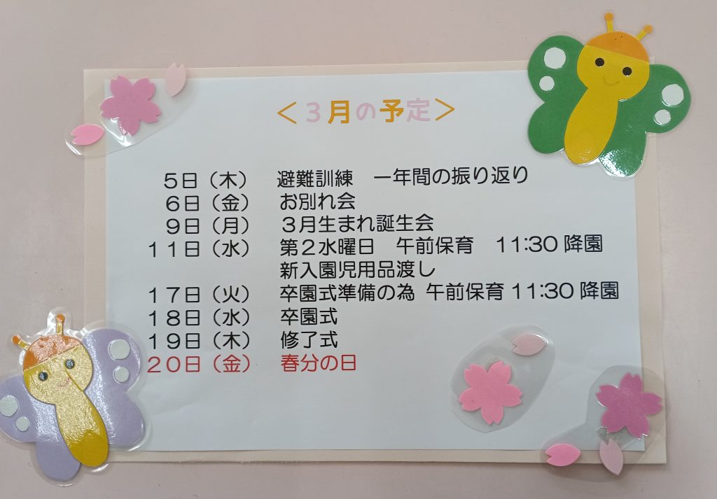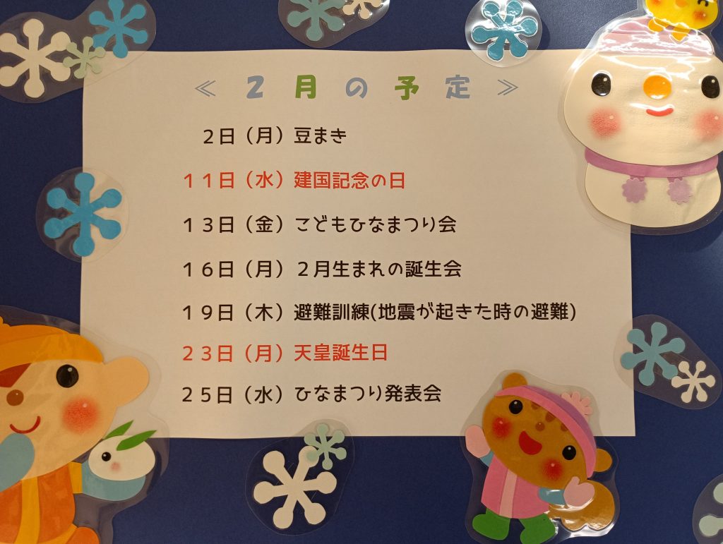 <行 事 予 定> 令和8年度の親子教室「ひよこ広場」の募集は行いません。 🌸「幼稚園であそぼう」を開催していきますので是非「幼稚園であそぼう」にご参加 お待ちしています。 日時については、令和8年度5月以降からお知らせしていきます。🌸 最近の投稿 豆まき2026年02月02日 大縄跳びに挑戦中です 2026年01月30日 誕生日会👑2026年01月26日 子ども達の様子2026年01月26日 避難訓練(火災)2026年01月22日 子どもたち真剣です✨ パズル🧩2026年01月21日 ようちえんであそぼう⭐2026年01月20日 体育教室(なわとび)2026年01月19日 子どもたちの様子です2026年01月16日 作品展 2026年01月13日 最新記事一覧≫