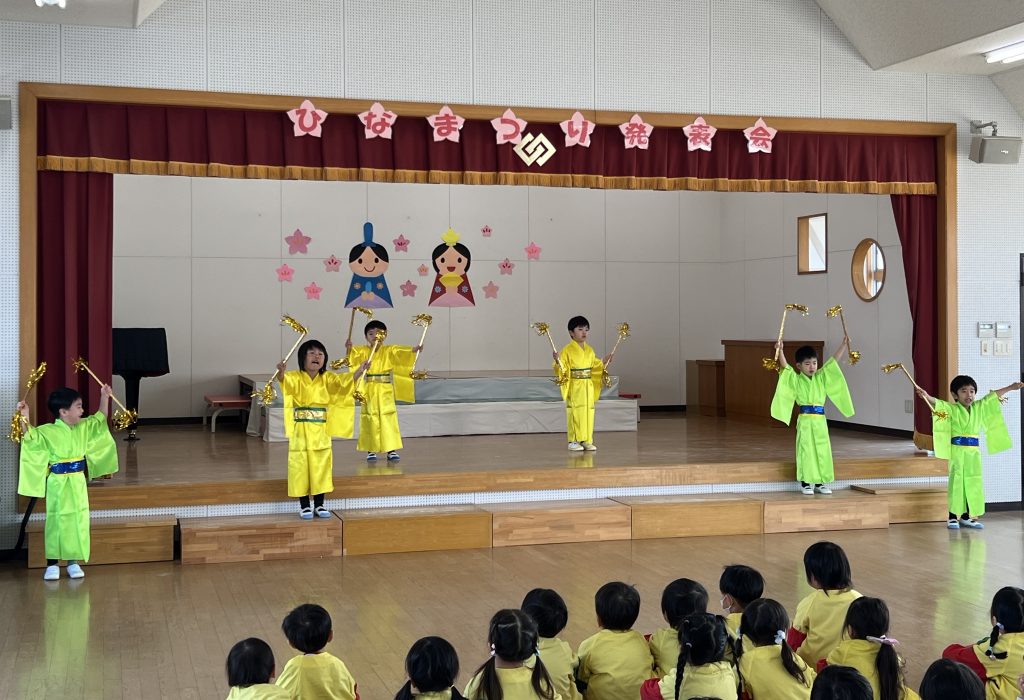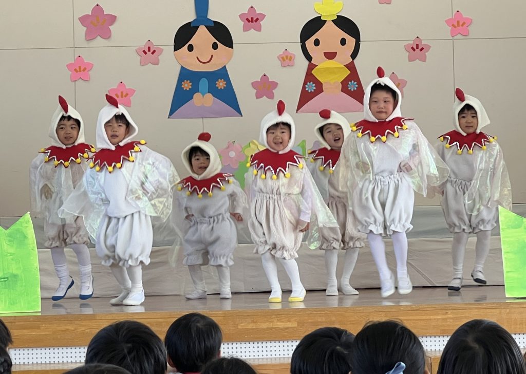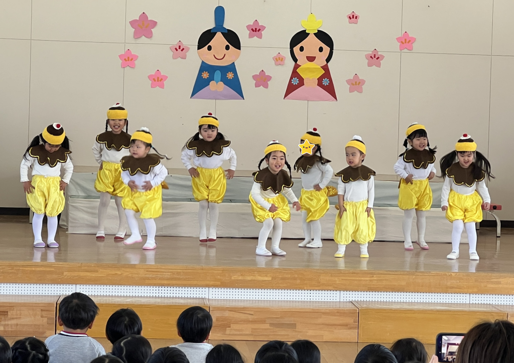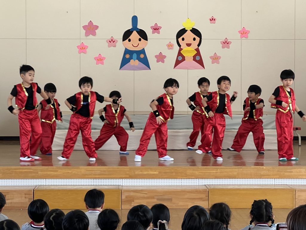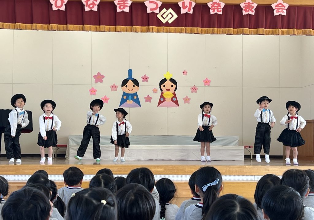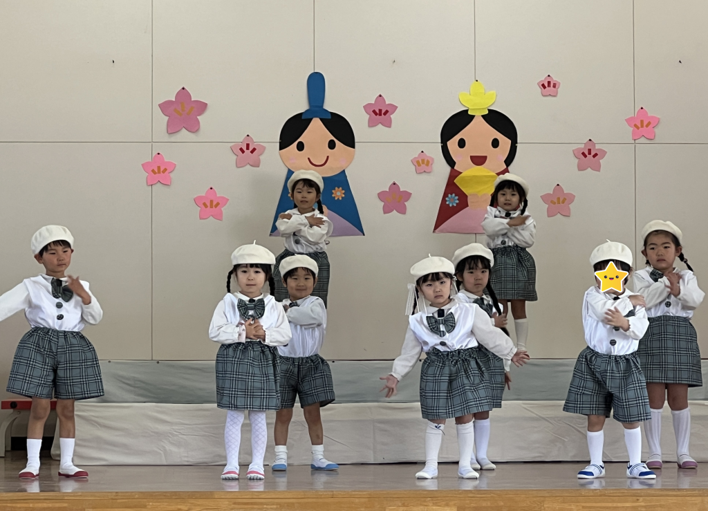 19日(木)に1部、20日(金)に2部のこどもひなまつり会を行いました。みんな発表会の衣装を着て嬉しそうでした。音楽が流れると、本番さながら楽しそうに踊っていましたよ。