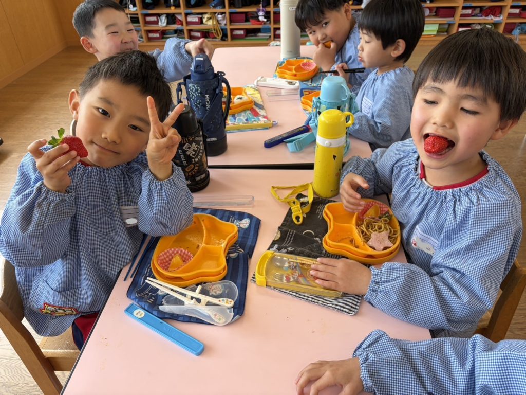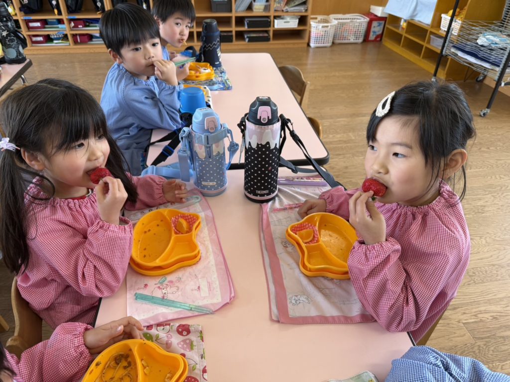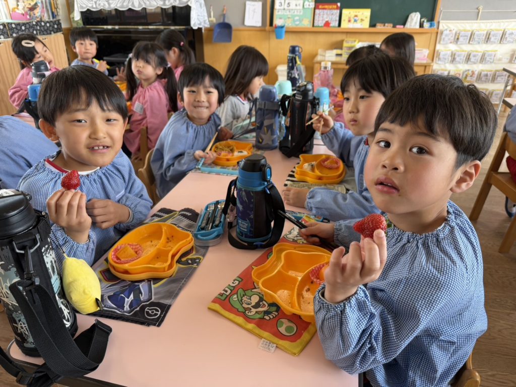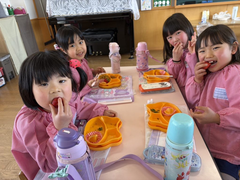 3月8日は「みつばち感謝の日」でした。それにちなんでJA全農ふくれんより食育事業として、アスター幼稚園に博多あまおうが届きました。紙芝居を見たりあまおうについての話を聞いたりして、5日(木)の昼食後に園児一人ひとつずついちごを食べました。みんな大喜びでおいしそうに食べていましたよ!そのときのすみれ組さんの様子をお知らせします。