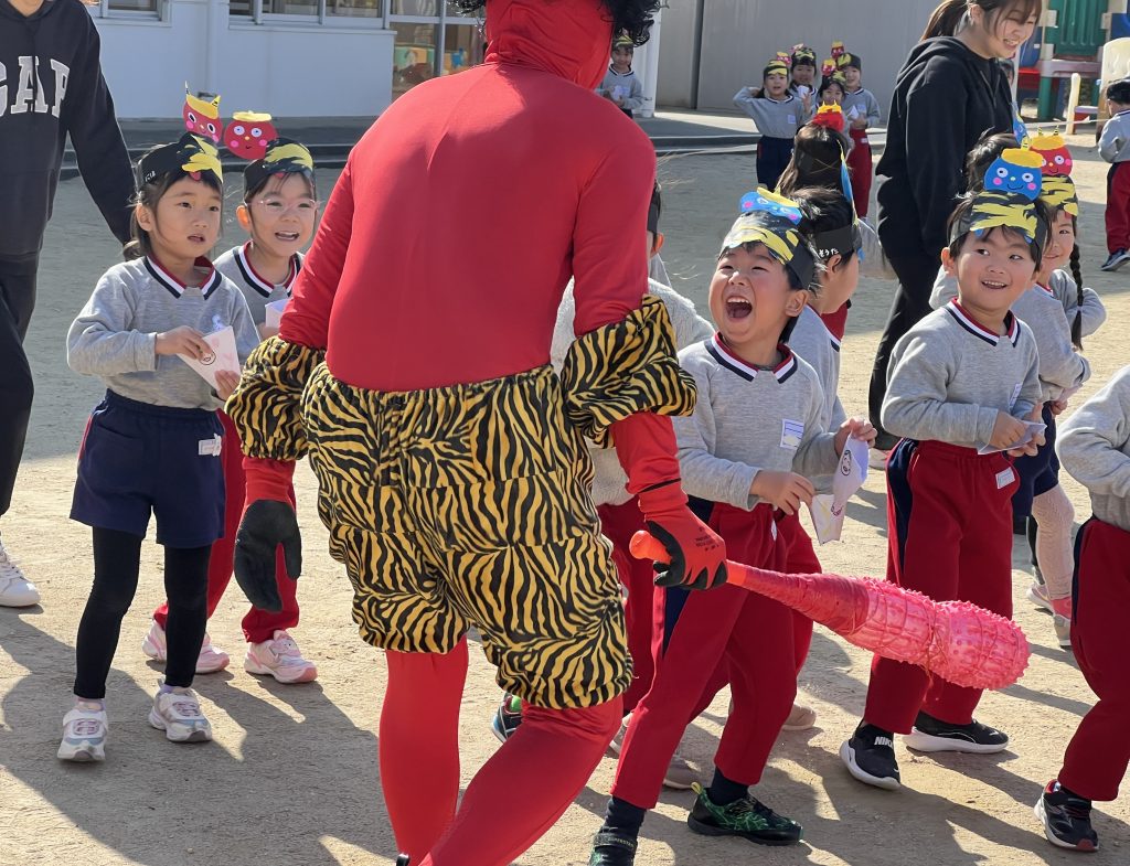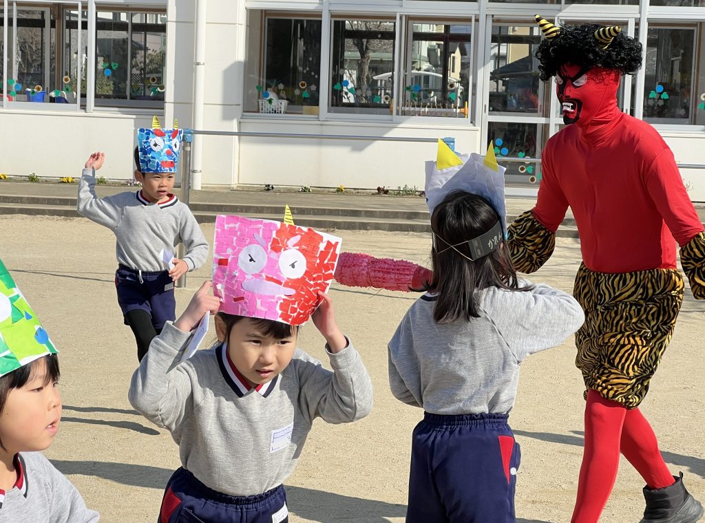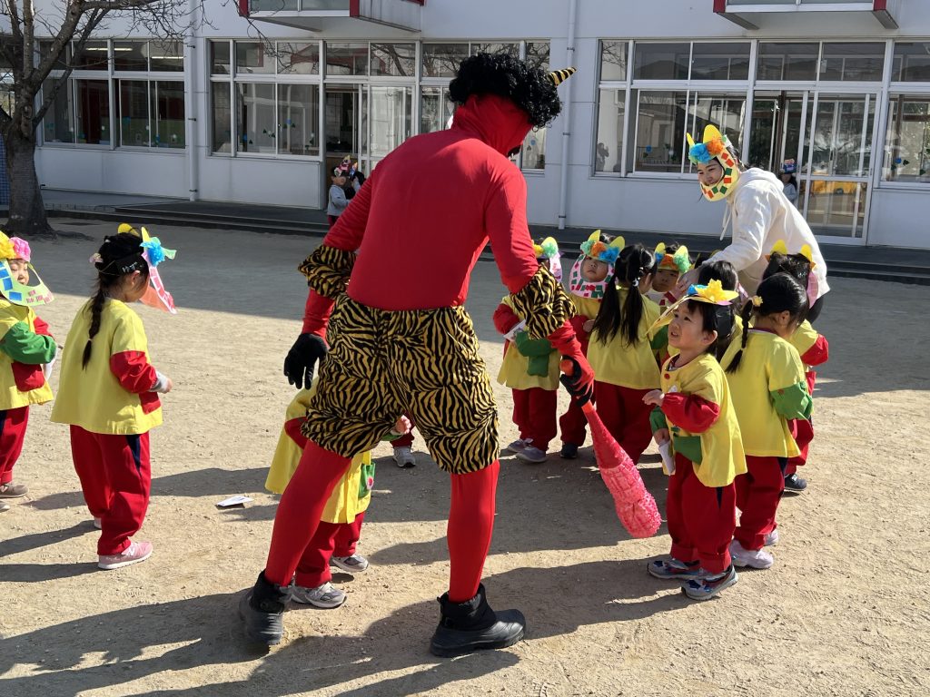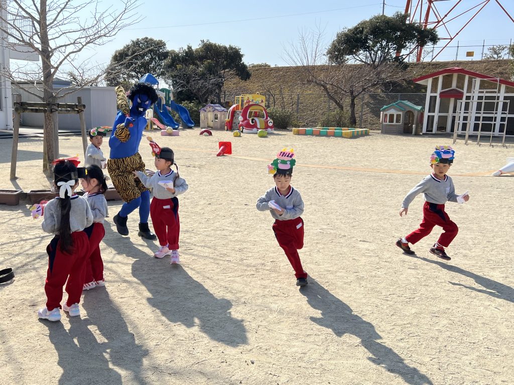 本日は豆まき会でした。遊戯室に集まった子ども達は、豆まきについての話を聞き、歌ったり踊ったりした後、学年ごとに園庭に出て豆まきをしました。赤鬼さんと青鬼さんが来るとみんな一斉に豆を投げていました。怖くて先生の所に来て豆を投げる子、逃げ回って豆を投げる子と様々でしたが、鬼が逃げていくとみんな大喜びでした。心の中の悪い鬼さんを退治できました。
