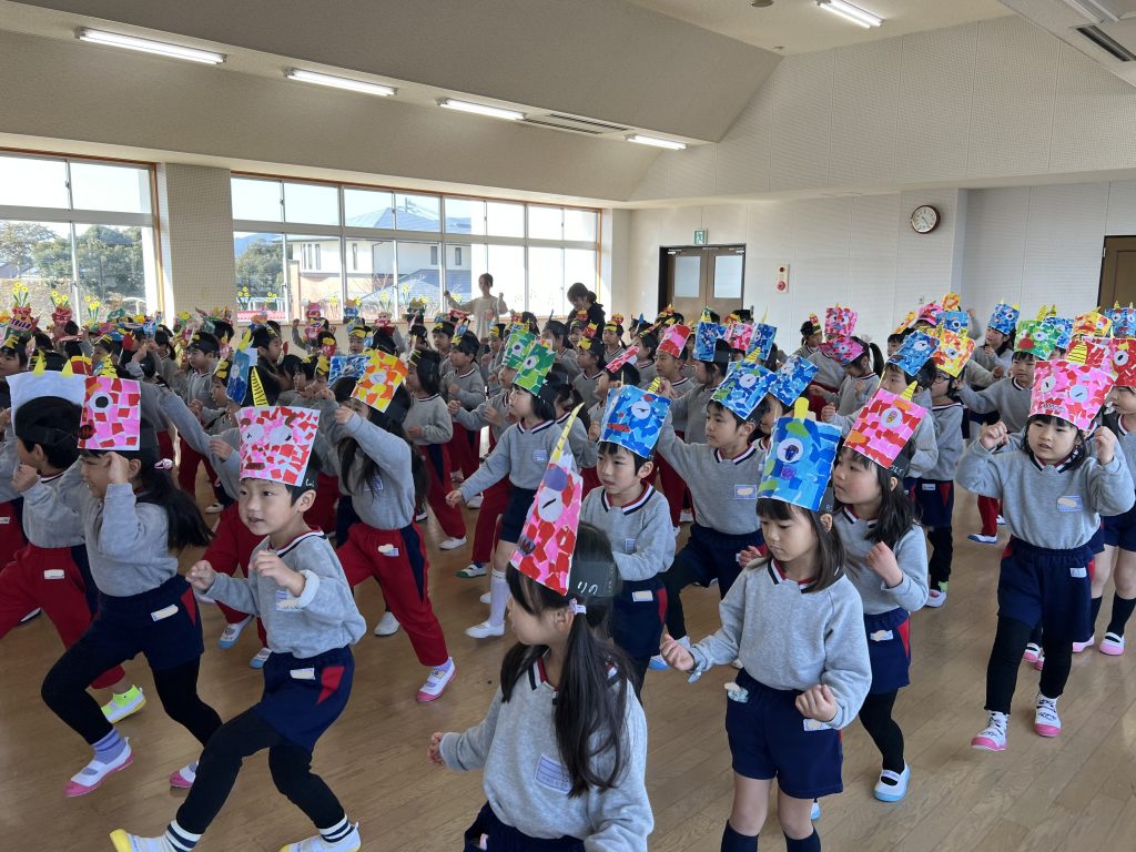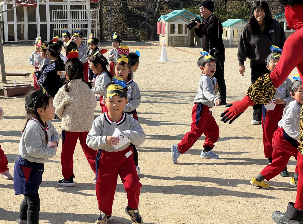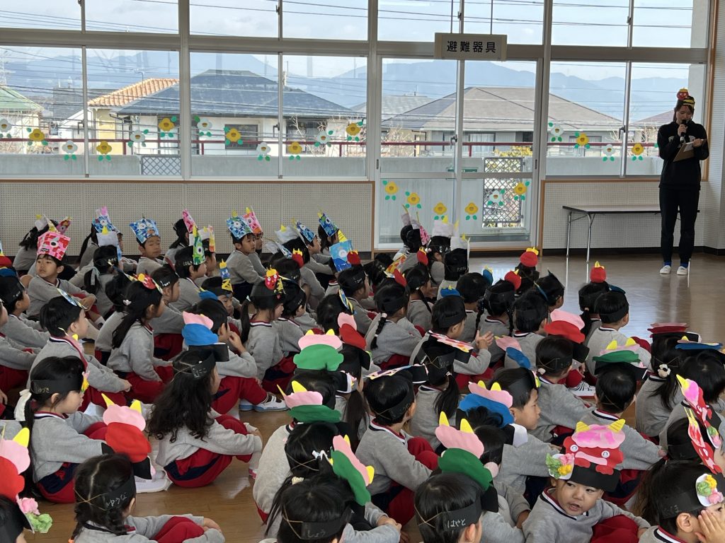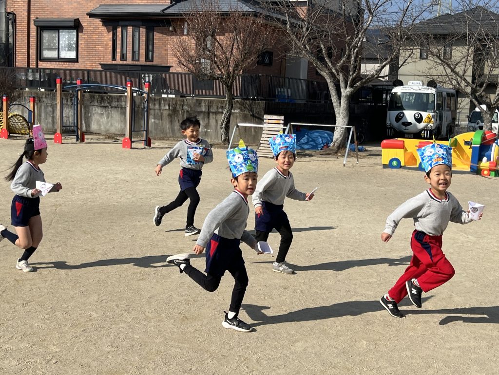 本日は豆まき会でした。遊戯室に集まった子ども達は、豆まきについての話を聞き、歌ったり踊ったりした後、学年ごとに園庭に出て豆まきをしました。赤鬼さんと青鬼さんが来るとみんな一斉に豆を投げていました。怖くて先生の所に来て豆を投げる子、逃げ回って豆を投げる子と様々でしたが、鬼が逃げていくとみんな大喜びでした。心の中の悪い鬼さんを退治できました。