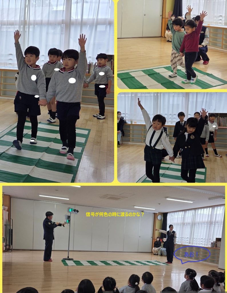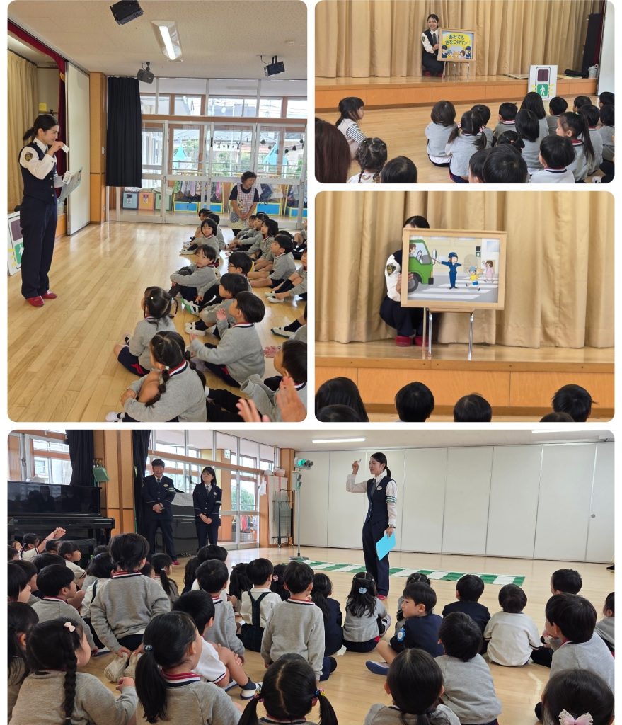 2025年11月11日 / 最終更新日時 : 2025年11月13日 深沢幼稚園 園のたより 交通安全教室 玉川警察の方が来園し、交通安全教室を行ってくれました。 紙芝居を見たあと、実際に横断歩道を渡る練習をしました。 『右を見て、左を見て、もう一度右を見て、身体を大きく見せるように手を高く上げて渡りましょう。』と教えていただきました。