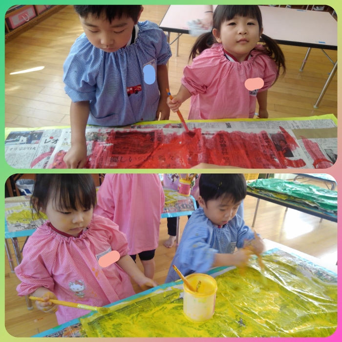2018年04月26日 / 最終更新日時 : 2018年04月26日 深沢幼稚園 園のたより 桃組さんも慣れてきました♪ 桃組さん初めての絵の具に挑戦! 一生懸命ぬりぬり~♪ スモック着るのはちょっと大変! 手を洗ったら 自分のタオルで拭けるようになりました。