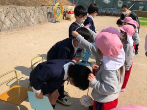 先日、『青空卒園式』と題して、青組さんのお別れ会をしました。青組さんに内緒で進めていた為、ばれないように冷や冷やドキドキ!!プレゼントづくりや練習をしている姿も見せないように入念に計画を立てました。当日は、『青空卒園式』なのでもちろん会場は園庭です!!赤組さんの『青組さんにお知らせします。今から、青組さんの青空卒園式をするので外に出てきてください。』の園内放送からスタートしました。青組さんの反応は・・・『えっ外??何で?』と、いい反応♡外に出てきた青組さんを赤組の代表のお友だちが会場へ誘導です!!