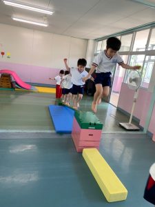 遊戯室での巧技台遊び。裸足になって、思い切り身体を動かしました。