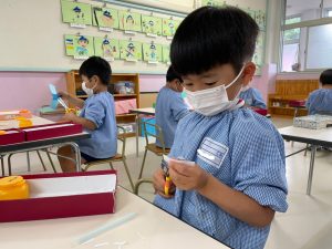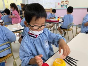 作品が置いてありました!!子どもたちは真剣な表情で見たり、触ったり、考えたりしていました。見た後は・・・自分で選んだ画用紙を取って席に戻り作り始めました。