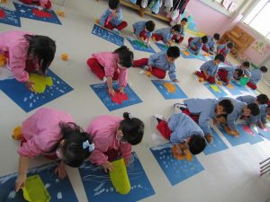 それぞれの役ごとに分かれて、ちぎり貼り(絵)をしました。最初は小さくちぎることが難しかった子どもたちも、家から持ってきた包装紙をたくさんちぎることでだんだんと上手になりました。