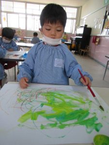 大きな模造紙に、筆を使って絵の具を塗りました。