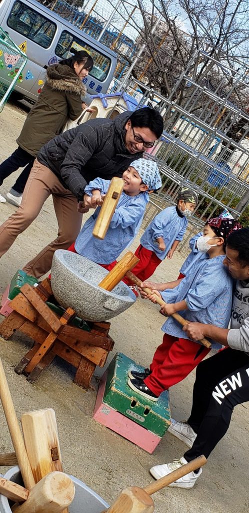 みんなで力を合わせてついたおもち。
