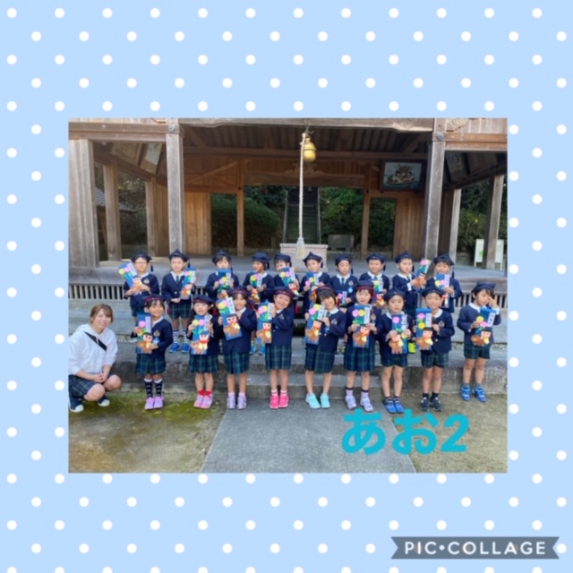 老松神社へ手作りの千歳飴の袋を持って、七五三のお参りに行きました。