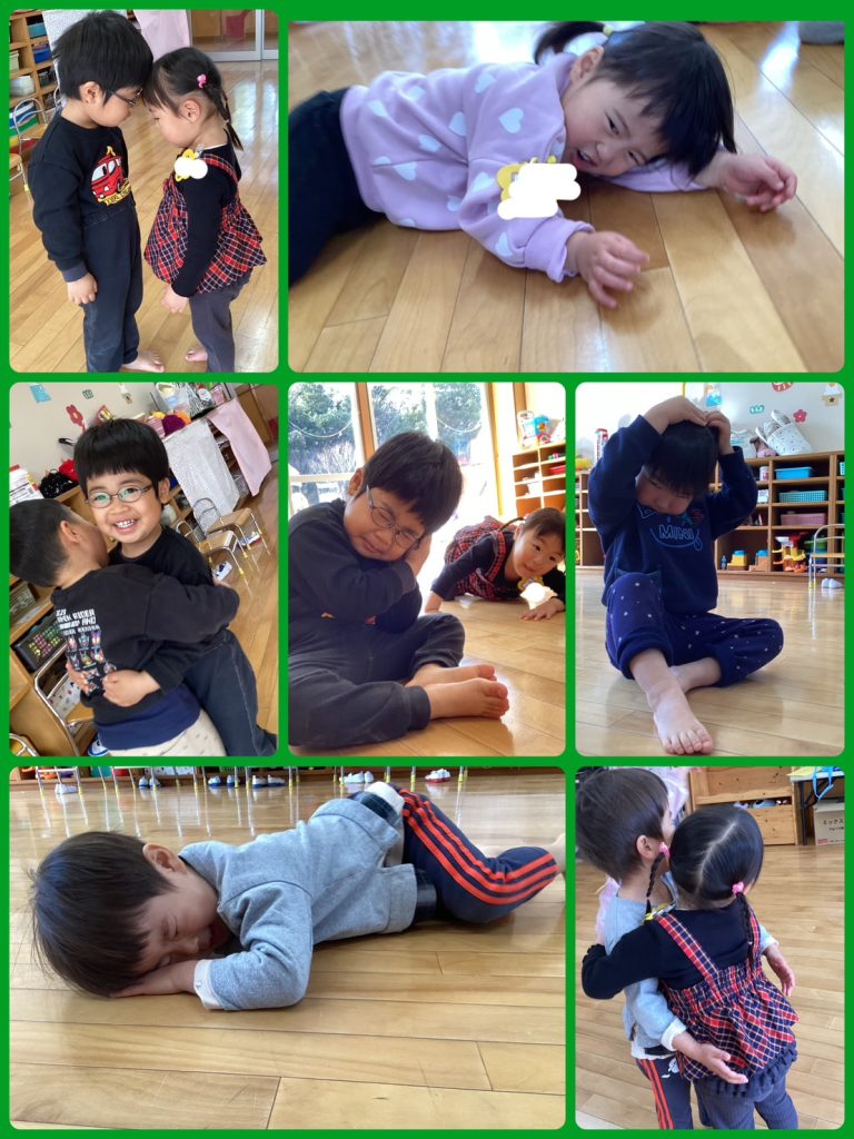 リトミックでは身体をくっつけて可愛い姿です。「ひっつきもっつき」というリズムあそびです。