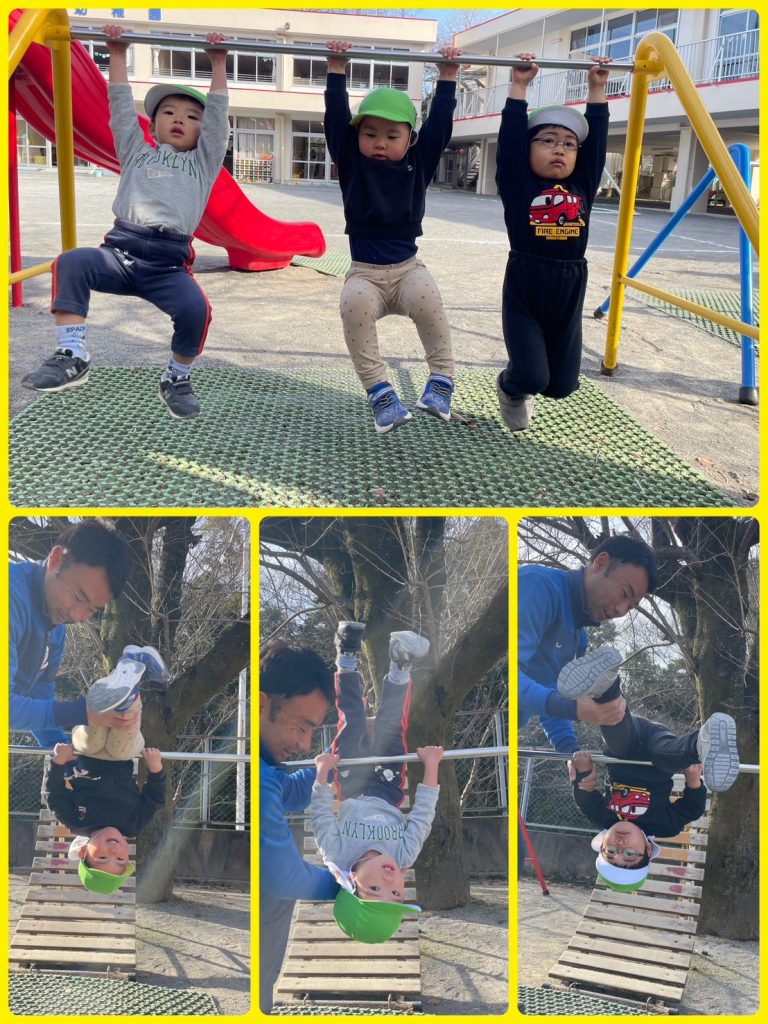鉄棒に挑戦です!仲良し3人組が微笑ましい姿です\(^o^)/