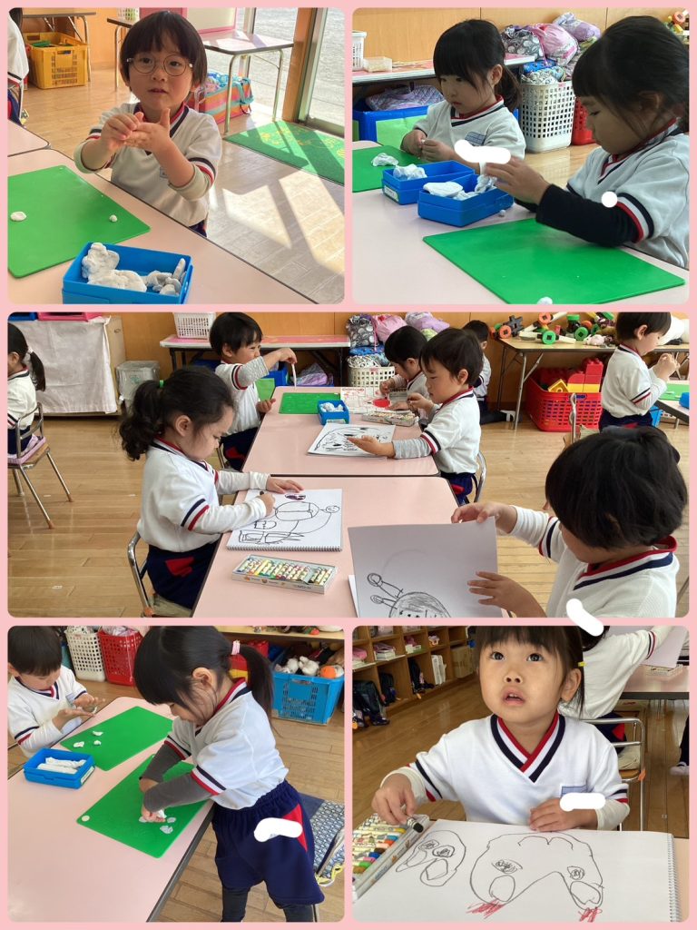 部屋では、粘土をしたり、お絵かきをしました。たんぽぽ組は豆まきの箱を作りました。