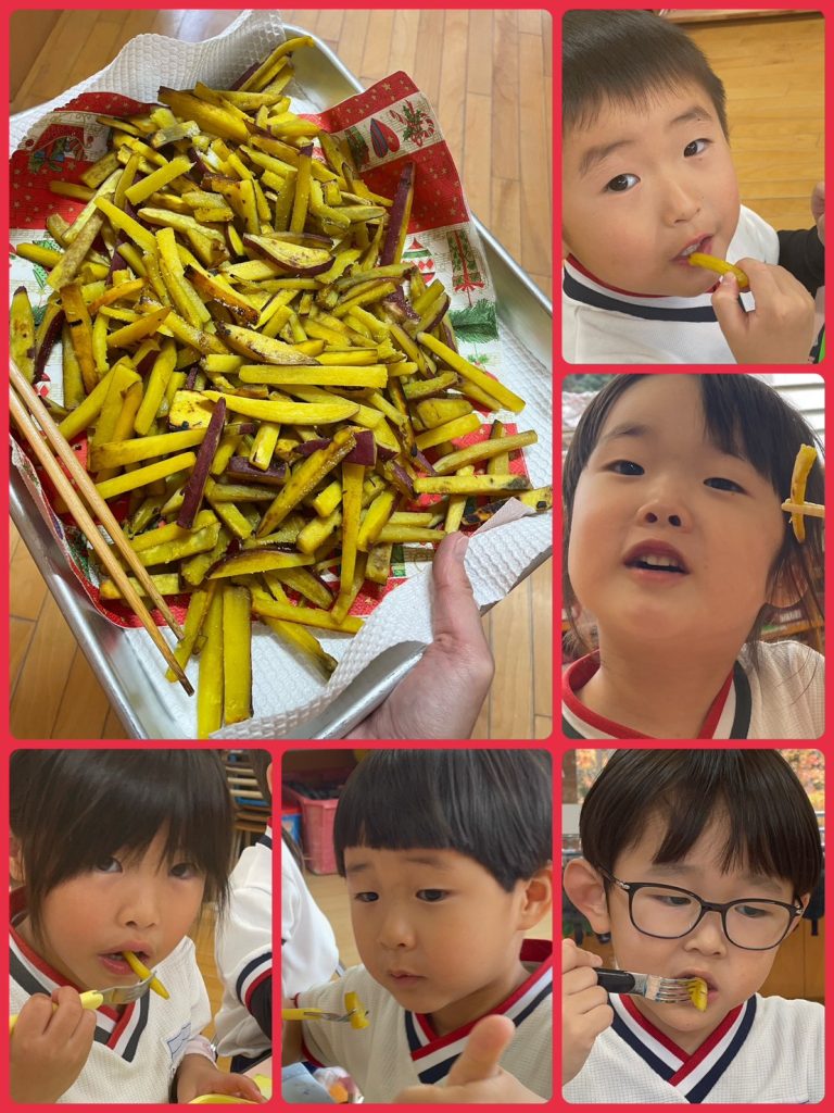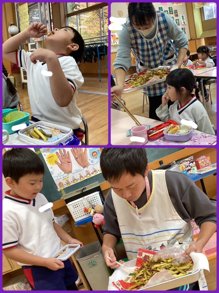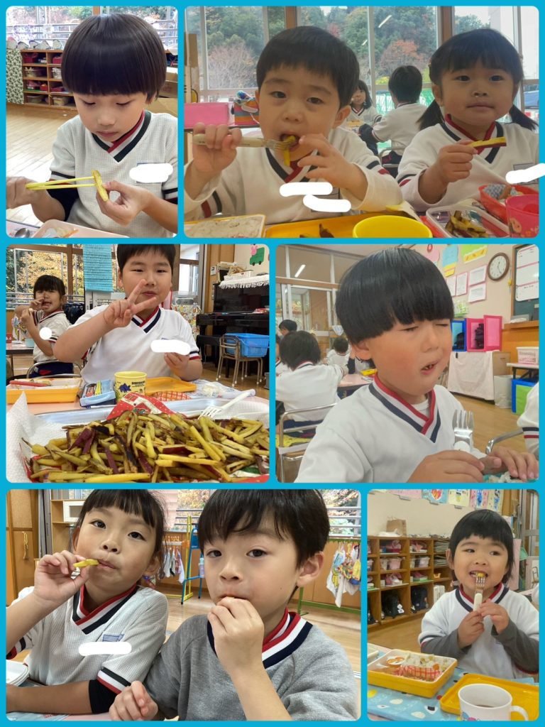 お芋掘りで掘ったお芋をみえ先生が調理してくれて食べました。大人気でおかわりもたくさんしてくれました。南多摩幼稚園はお料理が上手な補助の先生がたくさんいます♪