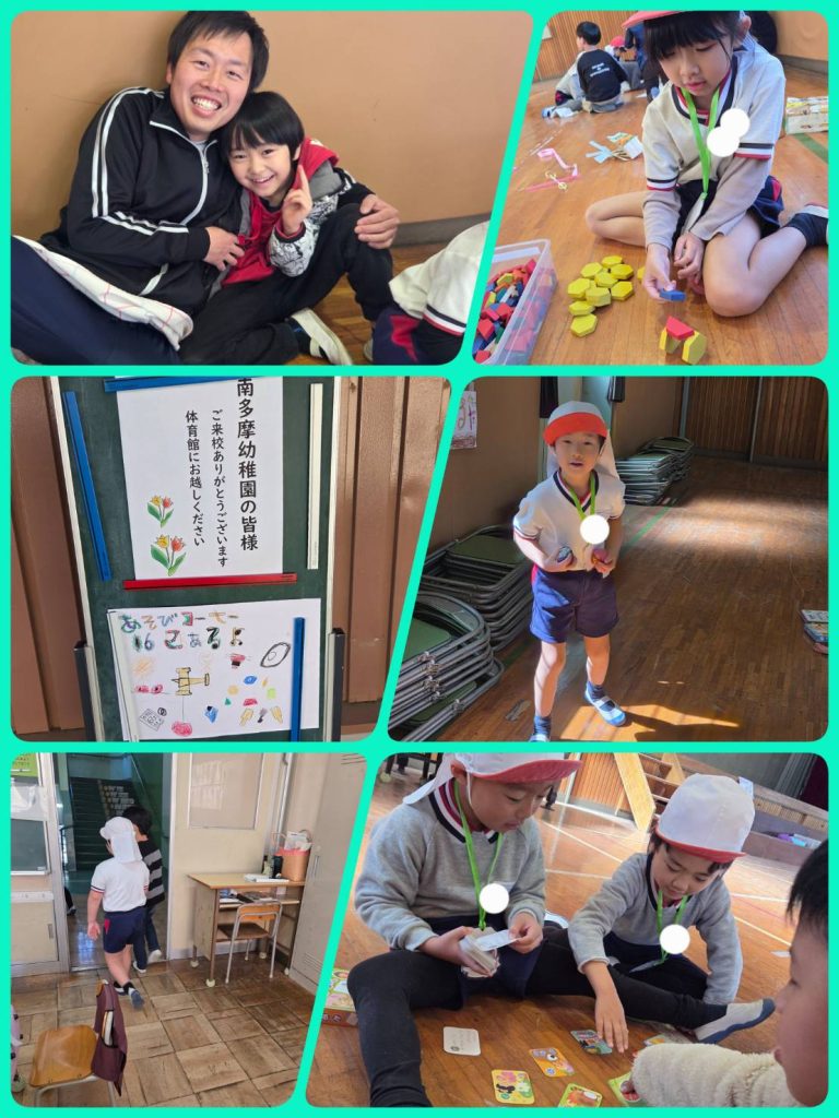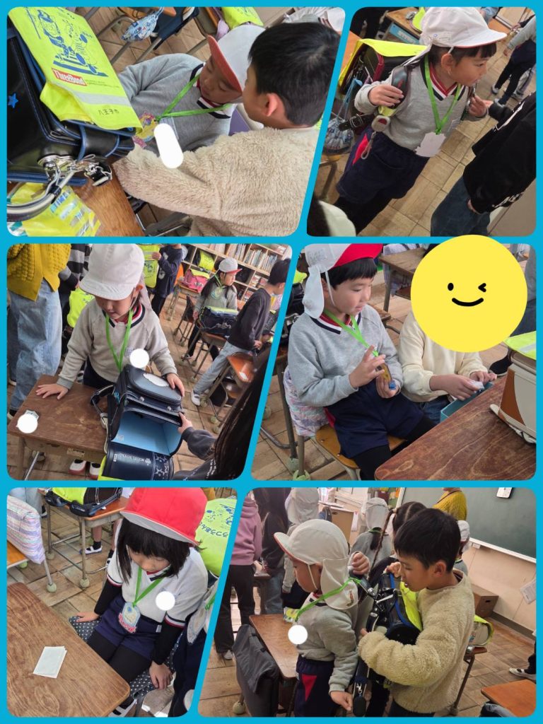 体育館ではたくさんの遊びコーナーがあり、教室ではランドセルを背負ったり、机に座らせてもらいました。