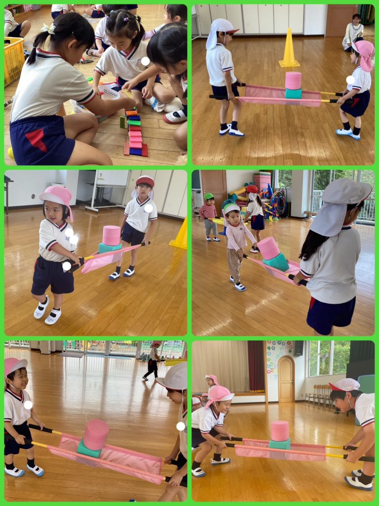 今日は雨でしたが縦割り保育をホールで行いました。マット運動、タンカリレー、体操を行いました。