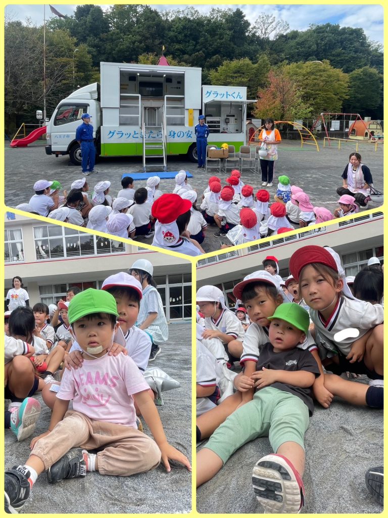 今日は避難訓練のあと、地震の揺れを体験できる「起震車」が園に来て、赤組は震度4、青組は震度5、職員は震度7の揺れを体験しました。