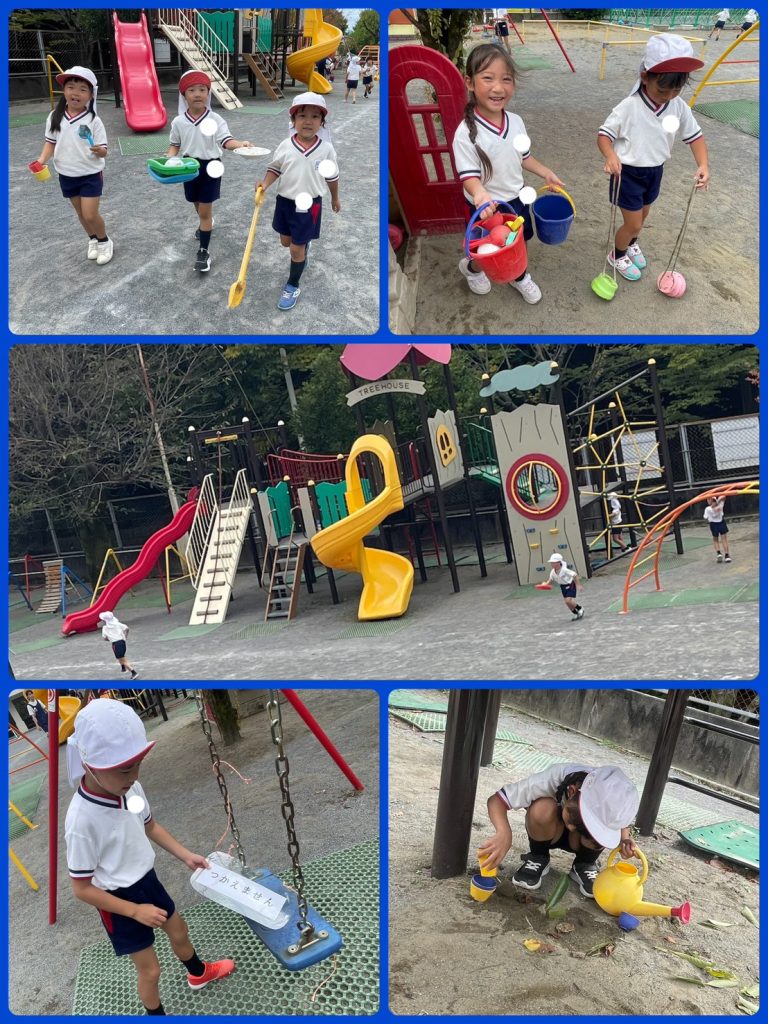 外遊びの片付け時間です。青組さんは片付けの達人です。