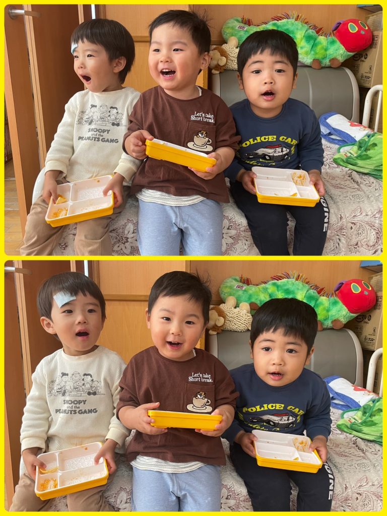 今日はみんな完食!!嬉しすぎて色々な先生やお兄さんお姉さんに見せに行っていた3人組です(*´∀`)