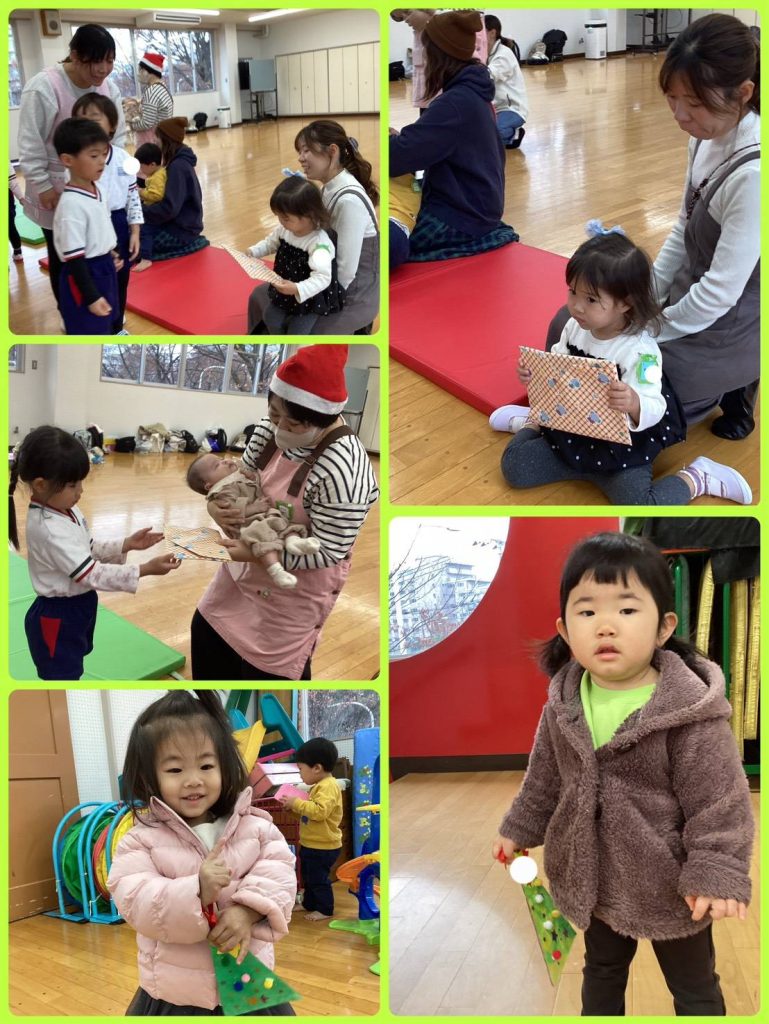 今日はクリスマス会でした。ツリーを作った後に、赤組さんとたんぽぽ組さんも参加をして、朝の会をしたり、パネルシアターを一緒にみました。