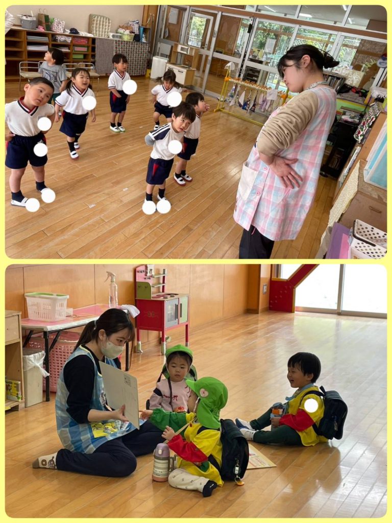 体操を踊っています♪先生が紙芝居を読んでくれています。