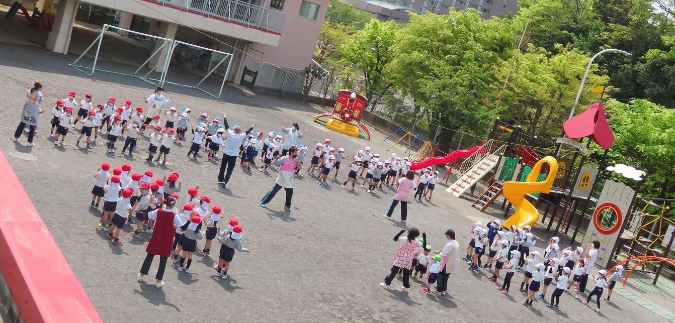 写真は、仲良しパーティ後の桃1組さんの外遊び風景です。
