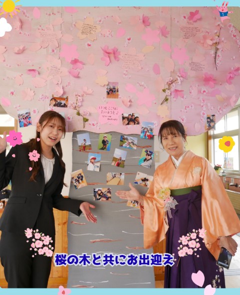 看板の前で保護者の方と記念撮影、玄関では先生たちのメッセージが咲く桜の木がお出迎え。