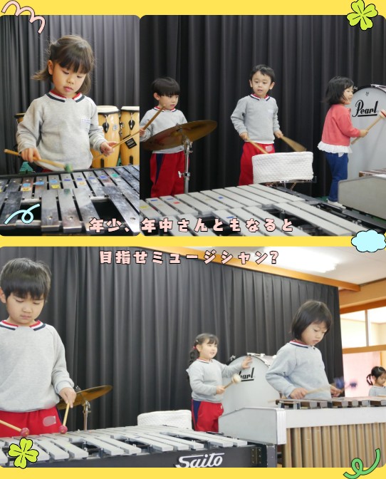 年少・年中さんは打楽器に挑戦。目指せミュージシャン?と思うほど真剣な表情。