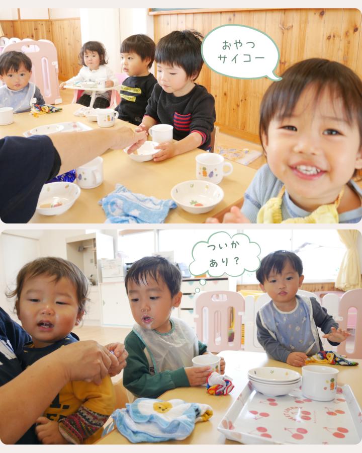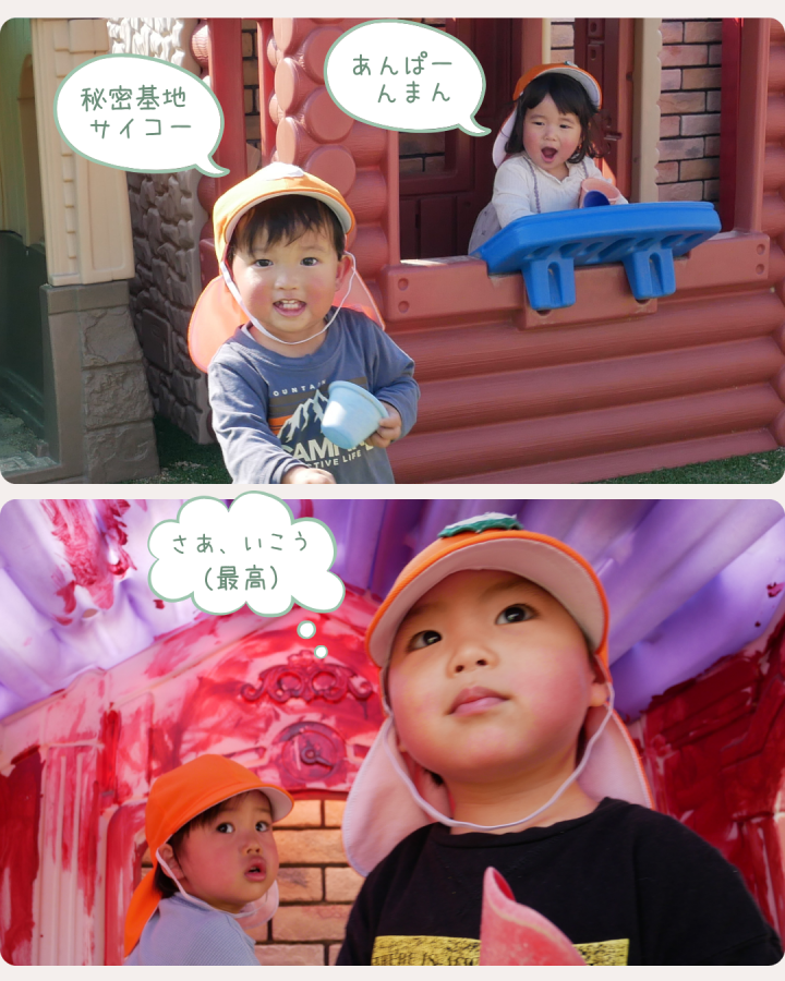 おやつを食べてにっこり「おやつサイコー」😊、秘密基地で「サイコー」、絵具とキャンバスの前では、「絵の神様、来てくれるかな?」と見つめる姿・・✨
