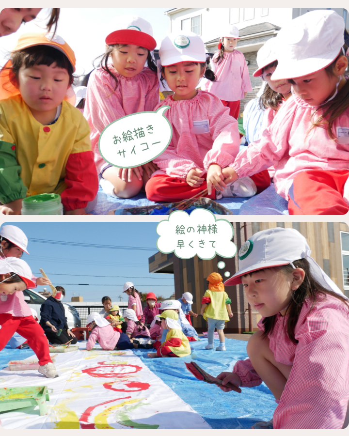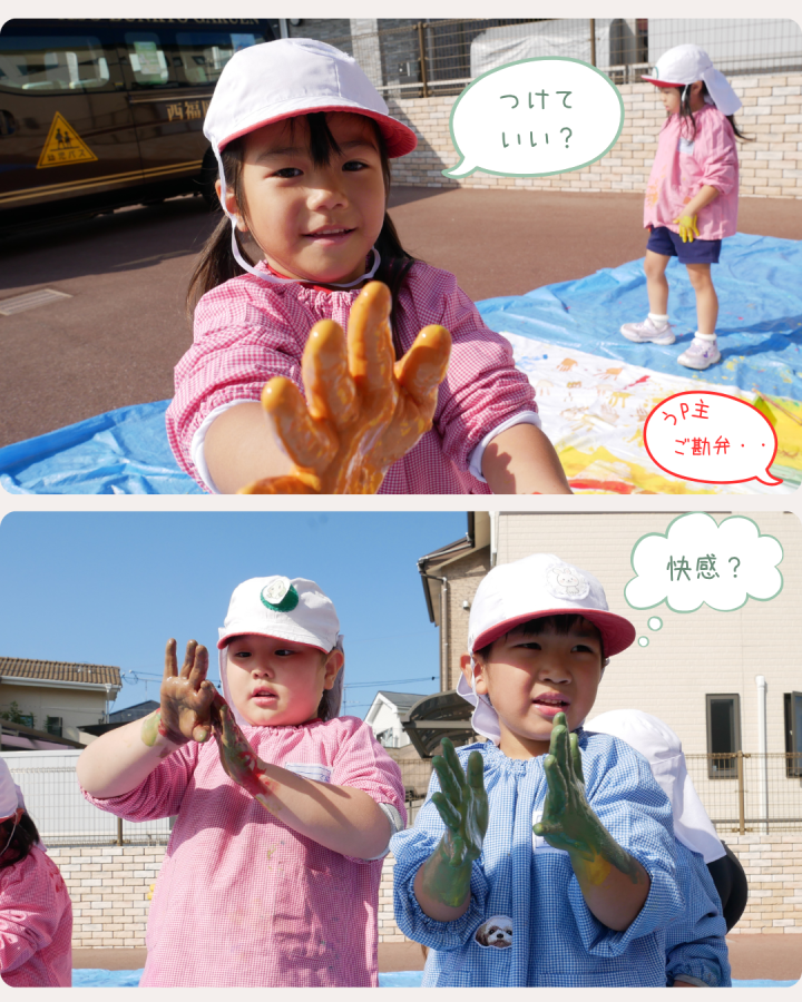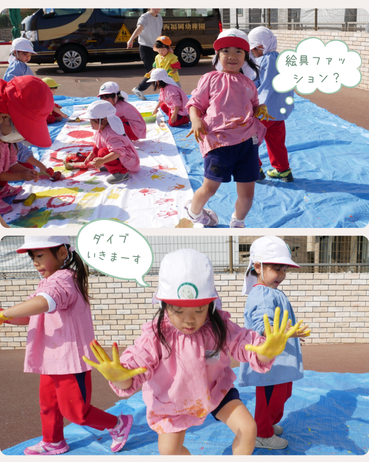 手もスモックも絵具まみれになって「これ、絵具ファッション?」なんて・・、思いきり制作を楽しみました。