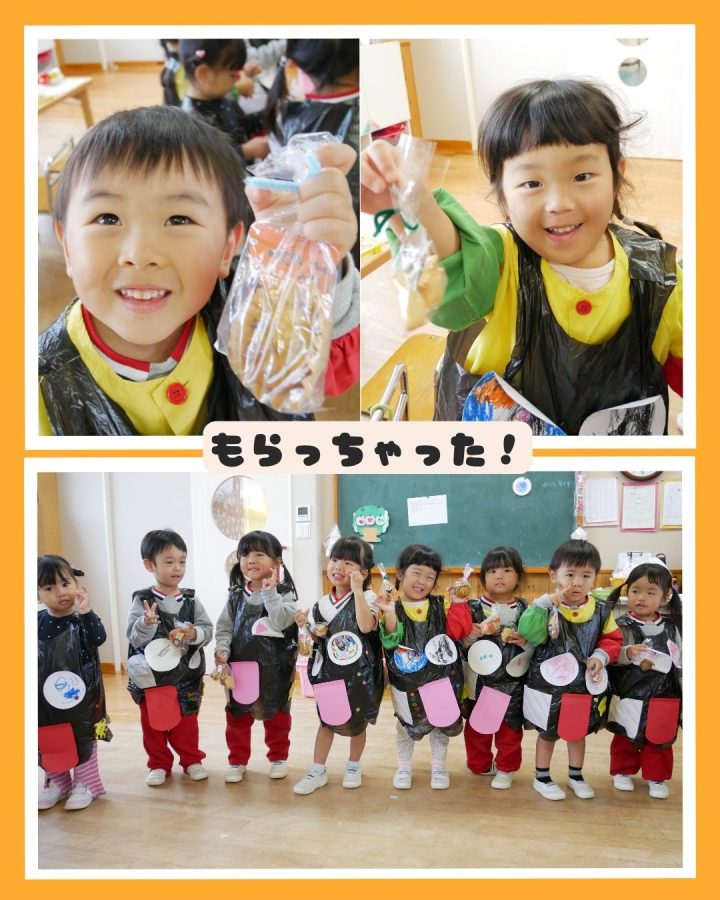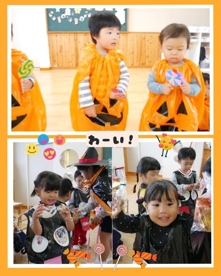 ちびっこは、かぼちゃに変身して登場🎃、おっきなペロペロキャンディ(紙製🍭)で楽しくあそびます! 年少さんは、年長さんから本物のお菓子をもらって「わーい!」💕、うれしそうに「もらっちゃった〜!」と笑顔がはじけます😄