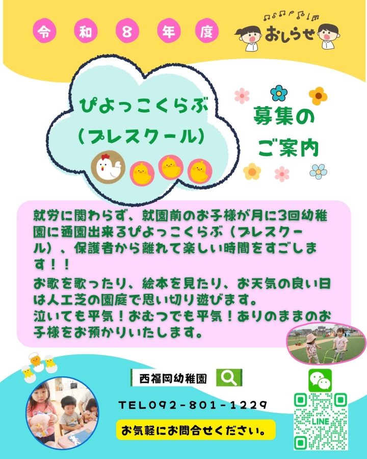 就園前のお子さまが、月3回幼稚園に通えるぴよっこくらぶ(プレスクール)の募集を行っております!