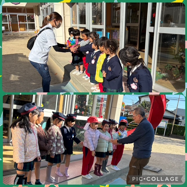 桃組さんは給食屋さん,青組さんはバスの運転手さんにみんなで作った花束を渡しました💐