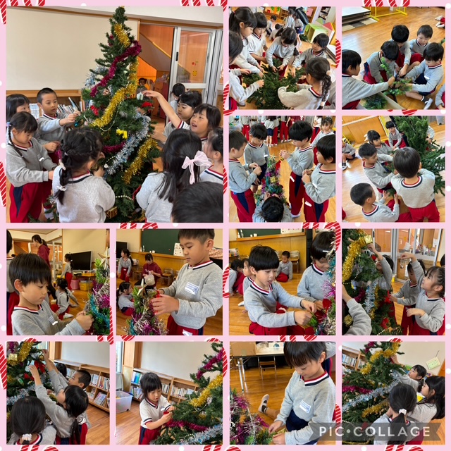 赤組さん,青組さんでクリスマスツリーの飾りつけをしました🎄