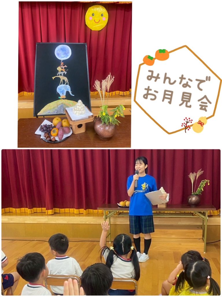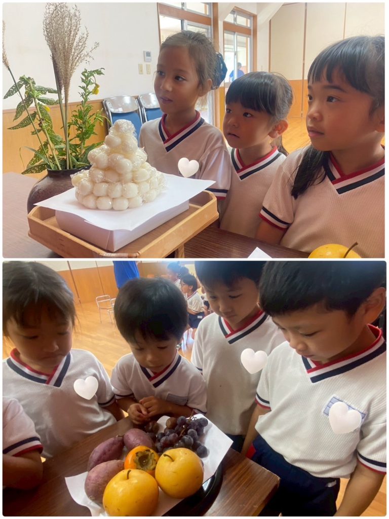 みんなでお月見会をしました。お月様のパネルシアターを見て嬉しそうな子ども達。お月見団子やお供え物にも興味津々♪お月様パワーで元気いっぱいな子ども達です。