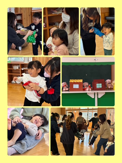 人形劇「3匹のこぶた」を見たり、親子でふれあい遊びをして楽しく過ごしました♪