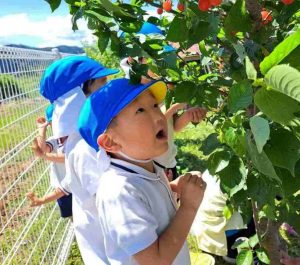 田んぼで蛙探し、田植え、園庭にはサクランボ!